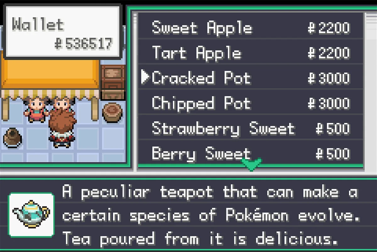 | 폴쇼어 시티(Fallshore City) – 폴쇼어 시티 시장 | 진화 도구 NPC에게 3,000 포켓달러에 구매 | ![]() |