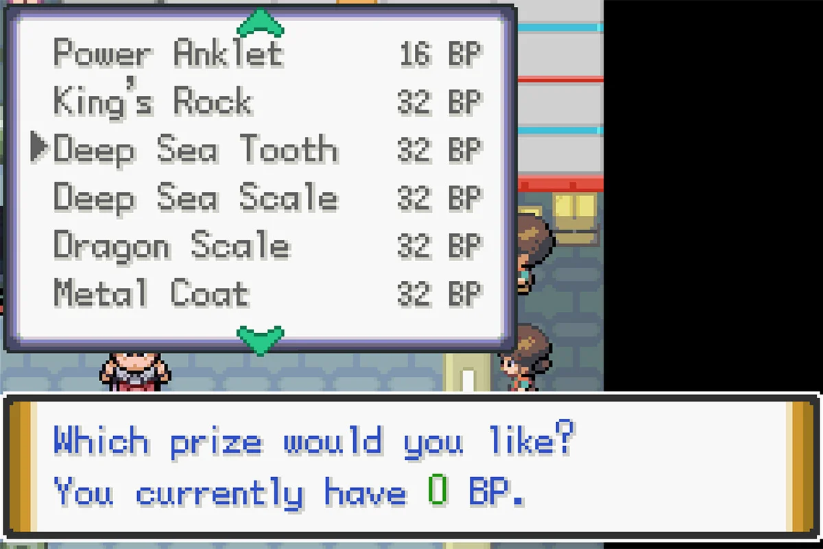| 2 | 배틀 프런티어(Battle Frontier) – 교환 서비스 카운터(건물 동쪽)에서 32 배틀 포인트(BP)로 교환 | 예 |