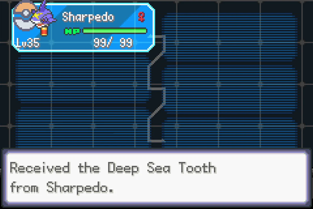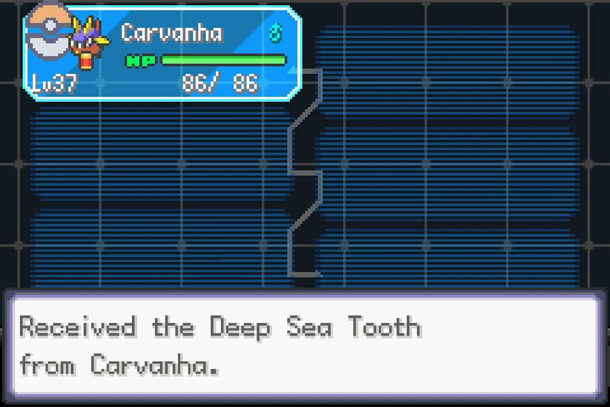 | 포켓몬 조우 – (12번 도로, 14번 도로, 17번 도로) | 야생 샤프니아(Carvanha)가 소지 (5% 확률) | ![]() |
