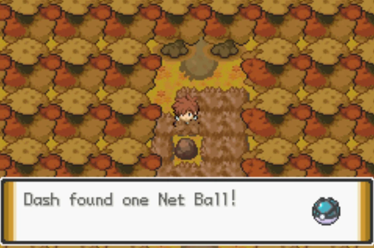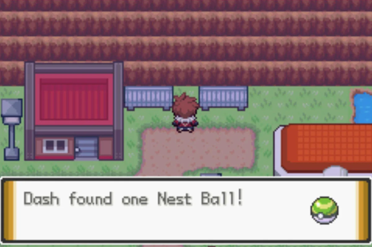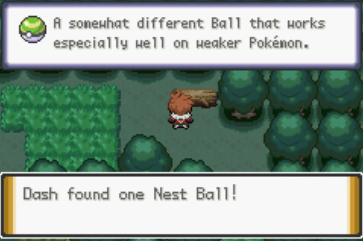 | 네스트볼 Nest Ball | 마을 북동쪽 구석, 포켓몬 센터 서쪽, 두 벤치 사이에 숨겨져 있음 |  |