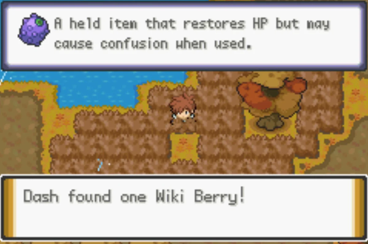 | 위키열매 Wiki Berry | 호수 남동쪽 기슭 긴 풀숲, 빈 곳에 숨겨져 있음 |  |