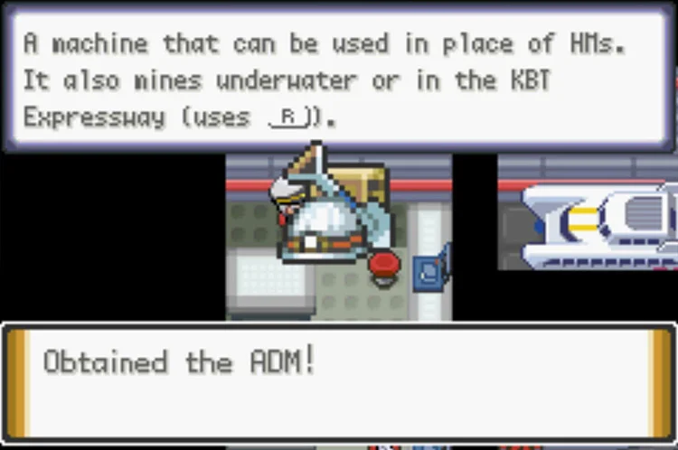 | ADM | 깊은 물에서 잠수(Diving)를 할 수 있게 해주며, 포켓몬이 비전머신을 배울 필요를 완전히 없애줍니다. 또한 지하 또는 수중에서 채굴할 때도 사용됩니다. | 씨포트 시티(Seaport City) 조선소 (엔딩 이후) 대비 선장(Captain Davy)에게 250,000원에 구매 | ![]() |