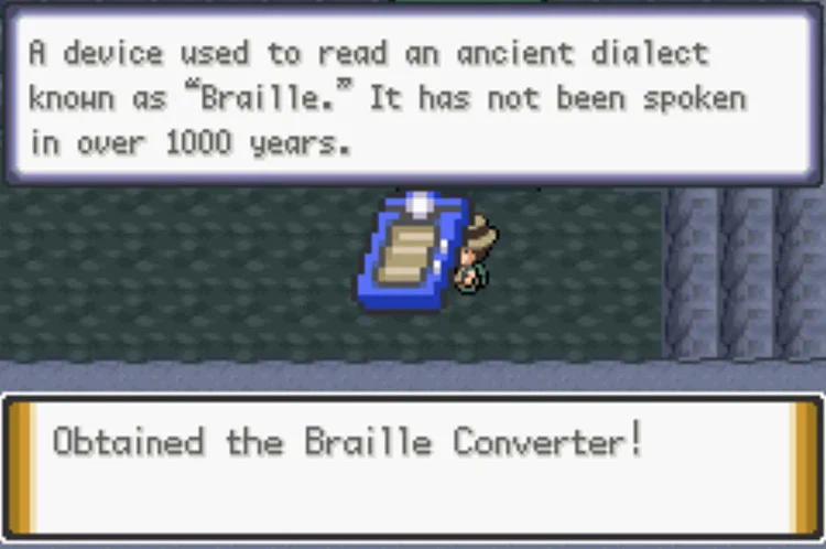 | 점자 변환기 Braille Converter | 고대 석판의 점자를 번역하여 퍼즐을 푸는 힌트를 주는 장치입니다. | 고드름동굴(Icicle Cave) 미션 #067: 식량 도둑(The Food Thief) 진행 중 알로라 고지(Sandslash)를 따라 숨겨진 터널로 들어간 후, 석판 근처의 유적마니아에게 말 걸기 | ![]() |