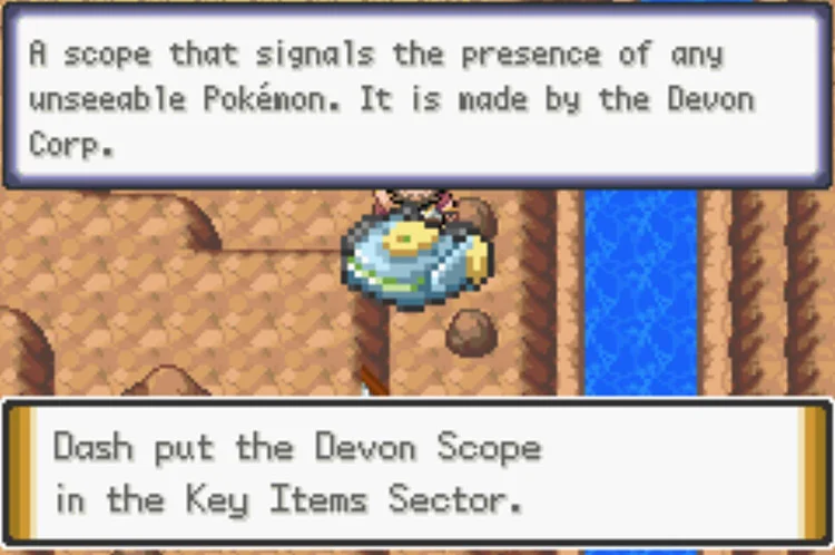 | 데봉스코프 Devon Scope | 보이지 않는 포켓몬을 드러냅니다. | 16번 도로(Route 16) 메인 스토리 중 빅 모(Big Mo)가 줌 | ![]() |