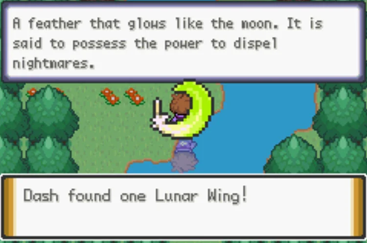 | 초승달날개 Lunar Wing | 타미간 타운(Tarmigan Town) 소년의 악몽을 치료하는 데 사용됩니다. | 만월섬(Fullmoon Island) 미션 #066: 끝없는 악몽(The Endless Nightmare) 중 크레세리아(Cresselia) 처치 | ![]() |
