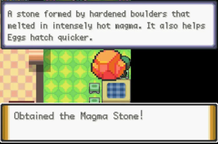 | 화산의돌 Magma Stone | 알을 부화시키는 데 필요한 걸음 수를 절반으로 줄여주며, 불꽃몸(Flame Body)이나 마그마의무장(Magma Armor) 같은 특성과 효과가 중첩됩니다. 또한 신더화산(Cinder Volcano)에서 히드런(Heatran)을 소환합니다. | 미션 보상 미션 #039: 마스터 인큐베이터(Master Incubator) 완료 | ![]() |
