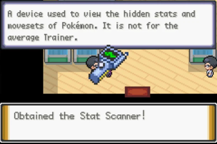 | 스탯 탐지기 Stat Scanner | 포켓몬의 숨겨진 능력치(개체값/노력치)와 기술 배치를 확인합니다. 업그레이드하면 원격으로 기술을 가르칠 수 있습니다. | 얼어붙은 고도(Frozen Heights) 로그 박사의 연구소에 있는 조수에게 말 걸기 (포켓몬 50마리를 잡아야 함) | ![]() |