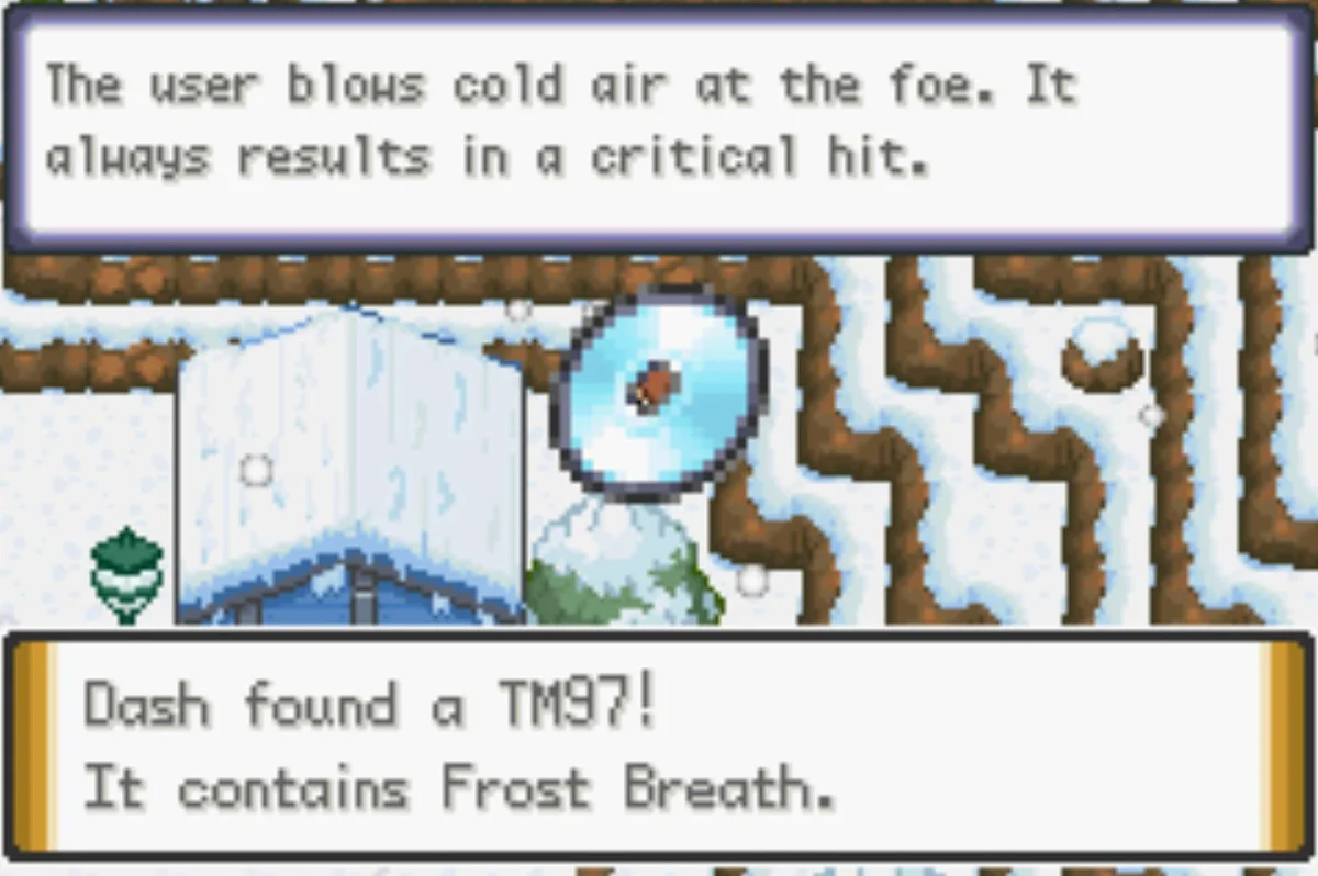 | 기술머신97 얼음숨결 Frost Breath | (락클라임 필요) 북동쪽 집 근처, 등반 가능한 벽 위 | ![]() |
