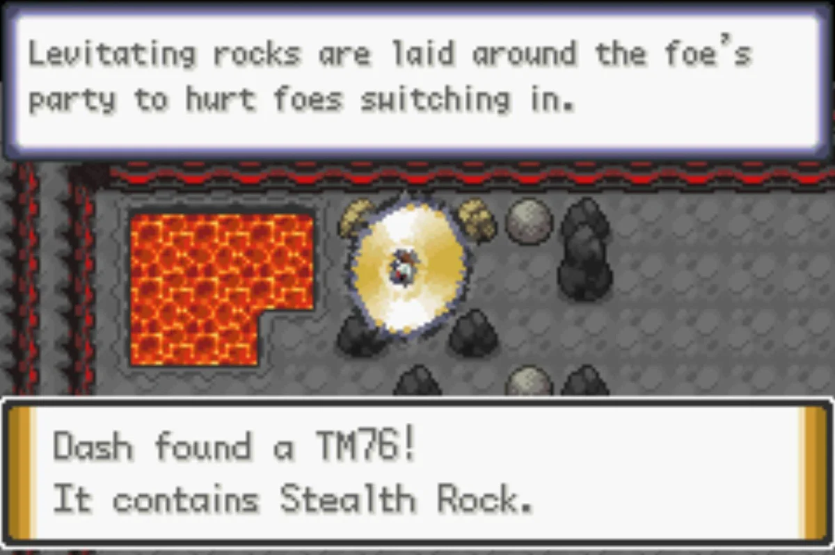 | 기술머신76 스텔스록 Stealth Rock | 그림자 유적의 방 북서쪽, 바위깨기로 부술 수 있는 바위 뒤 | ![]() |