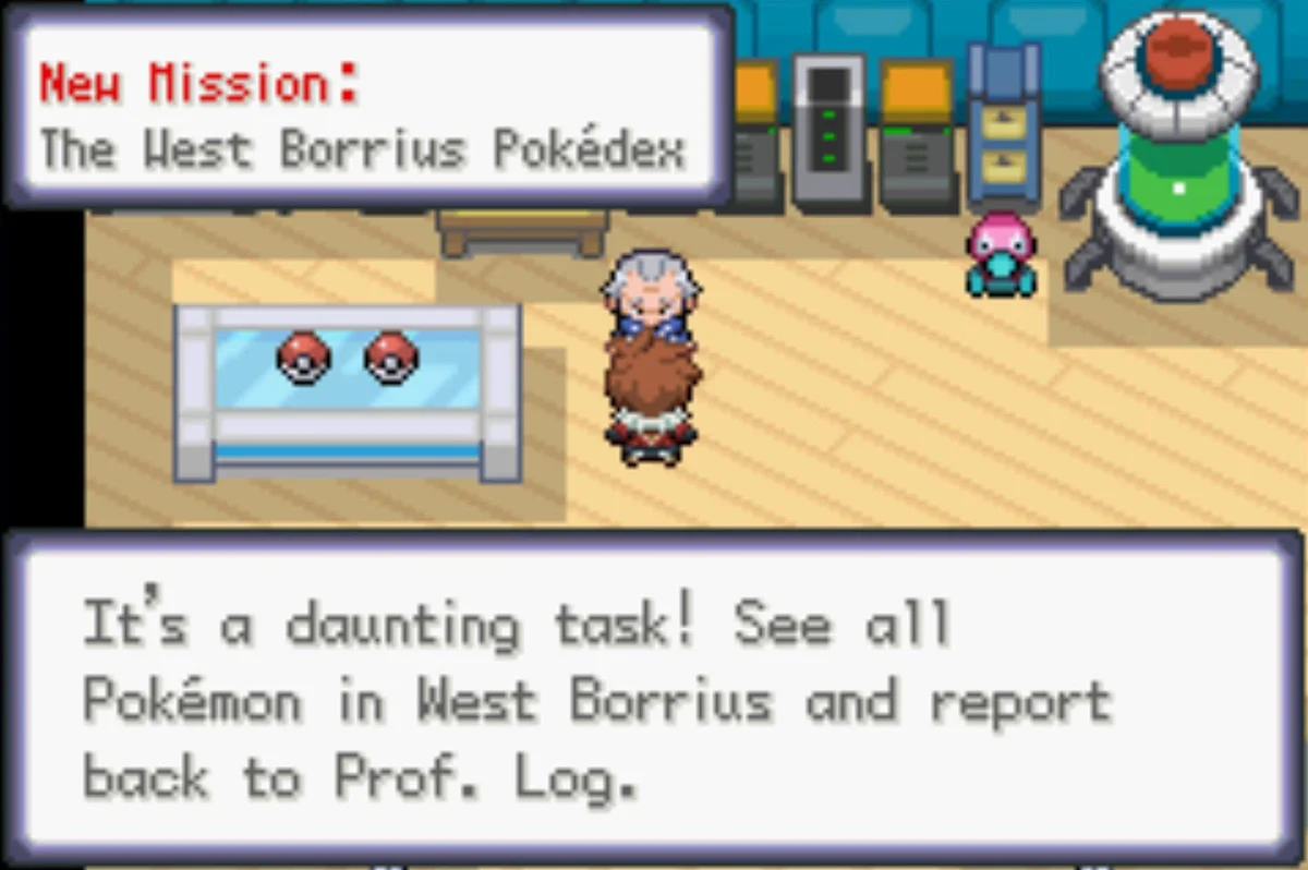 | #062: 서부 보리우스 도감(The West Borrius Pokedex) | 미션 시작 벨린타운(Bellin Town)에서 그의 소포를 돌려준 후 로그 박사(Professor Log)와 대화하세요 | ![]() |