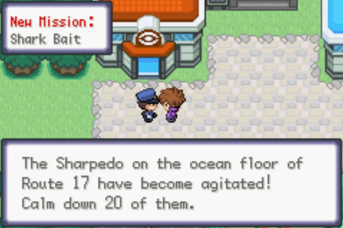 | #054: 상어 미끼 (Shark Bait) | 미션 시작 (포스트 게임) 포켓몬 센터 앞 경찰에게 말하세요. 미션 #073 The Terror Granbull 및 #071 The Rogue Electivire 완료 후 | ![]() |