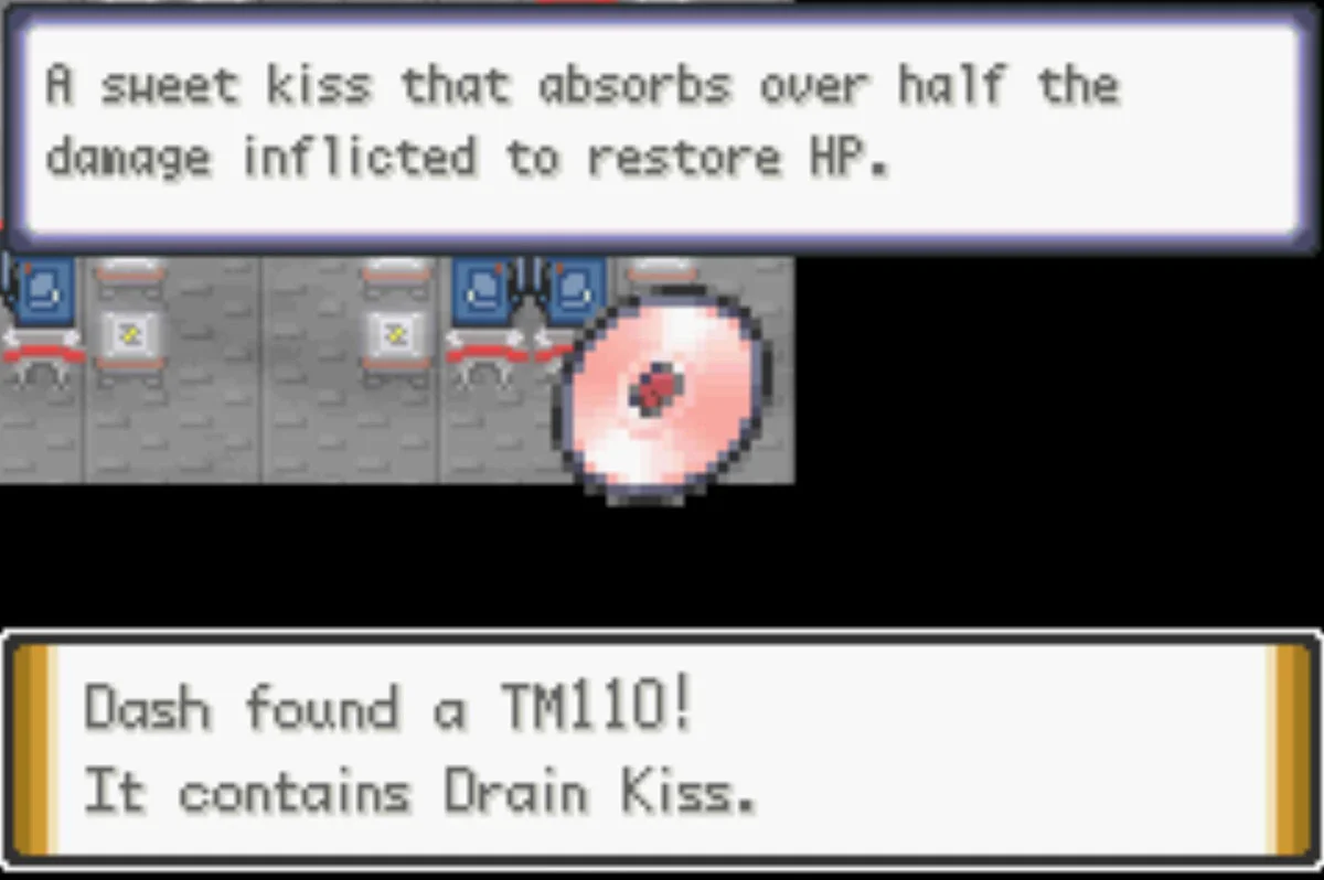 | 기술머신110 드레인키스(Drain Kiss) | (다이빙 Dive 필요) B4F 수중 연구실, 남동쪽 구석 | ![]() |