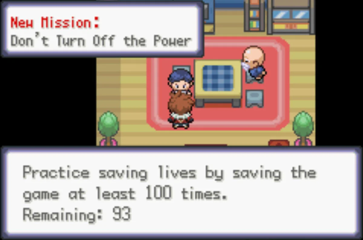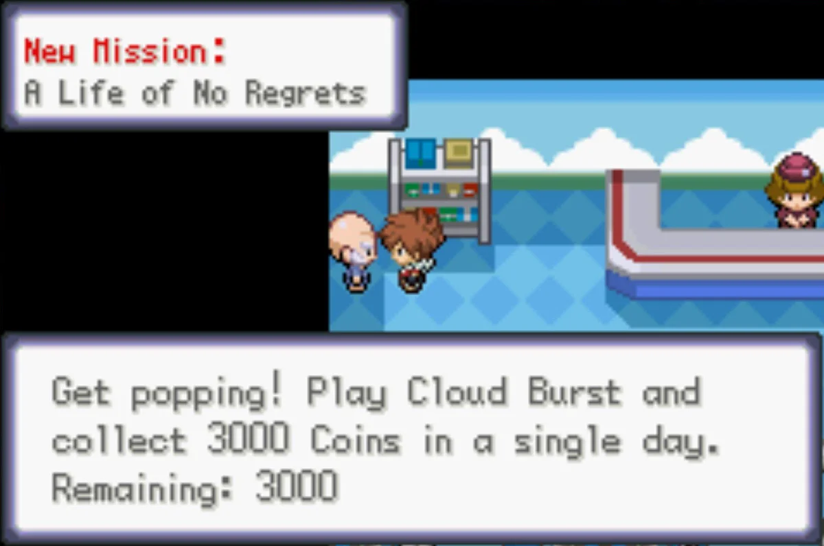 | #002: 후회없는 인생 (A Life of No Regrets) | 데하라 시티(Dehara City) 게임 코너 | 조건: 없음 게임 코너에서 클라우드 버스트(Cloud Burst)를 플레이하여 하루 만에 코인 3000개 모으기 | 포켓몬 풍선 피카츄 Pikachu | ![]() |