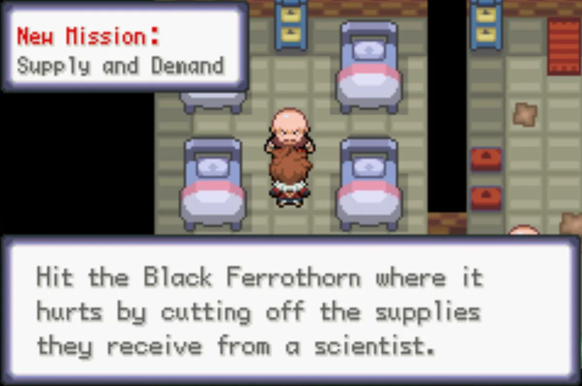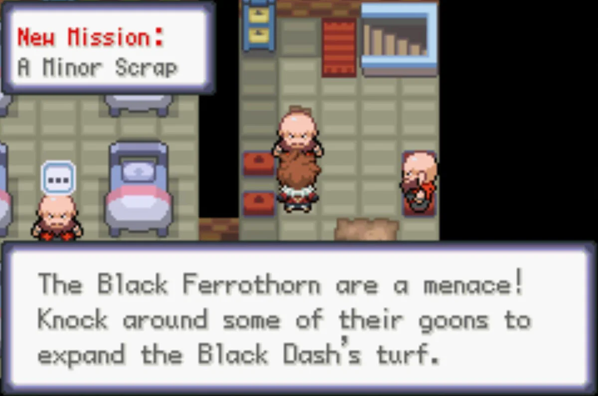 | #003: 사소한 다툼 (A Minor Scrap) | 안티시스 시티(Antisis City) 검은 염무왕 조직(Black Emboar) 본부 | 조건: #061: 검은 염무왕 (The Black Emboar) 및 #073: 공포의 그랑블루 (The Terror Granbull) 안티시스 시티(Antisis City) 거리에서 두 명의 검은 염무왕 조직(Black Emboar) 너트령 Ferrothorn 조직원과의 싸움에 참여 | 아이템 파워리스트 Power Bracer | ![]() |