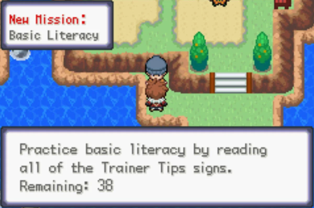 | #013: 기초 문해력 (Basic Literacy) | 드레스코 타운(Dresco Town) | 조건: 없음 게임 내의 40개 트레이너 팁 표지판 모두 읽기 | 아이템 노트 Notebook | ![]() |