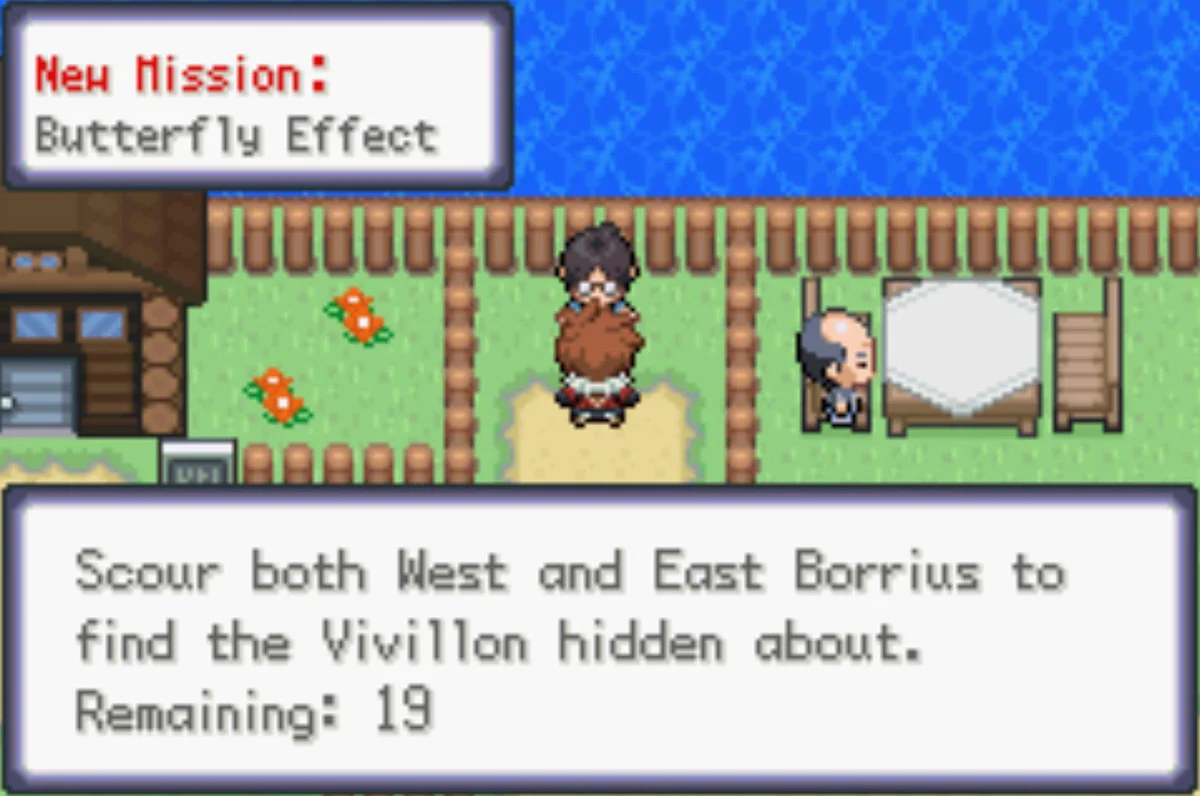 | #015: 나비 효과 (Butterfly Effect) | 매그놀리아 타운(Magnolia Town) | 조건: 없음 보리우스(Borrius) 지방의 모든 19종류 비비용 Vivillon 찾기 (의뢰자와 대화 후) | 포켓몬 이로치 몬스터볼 패턴 비비용 Vivillon | ![]() |