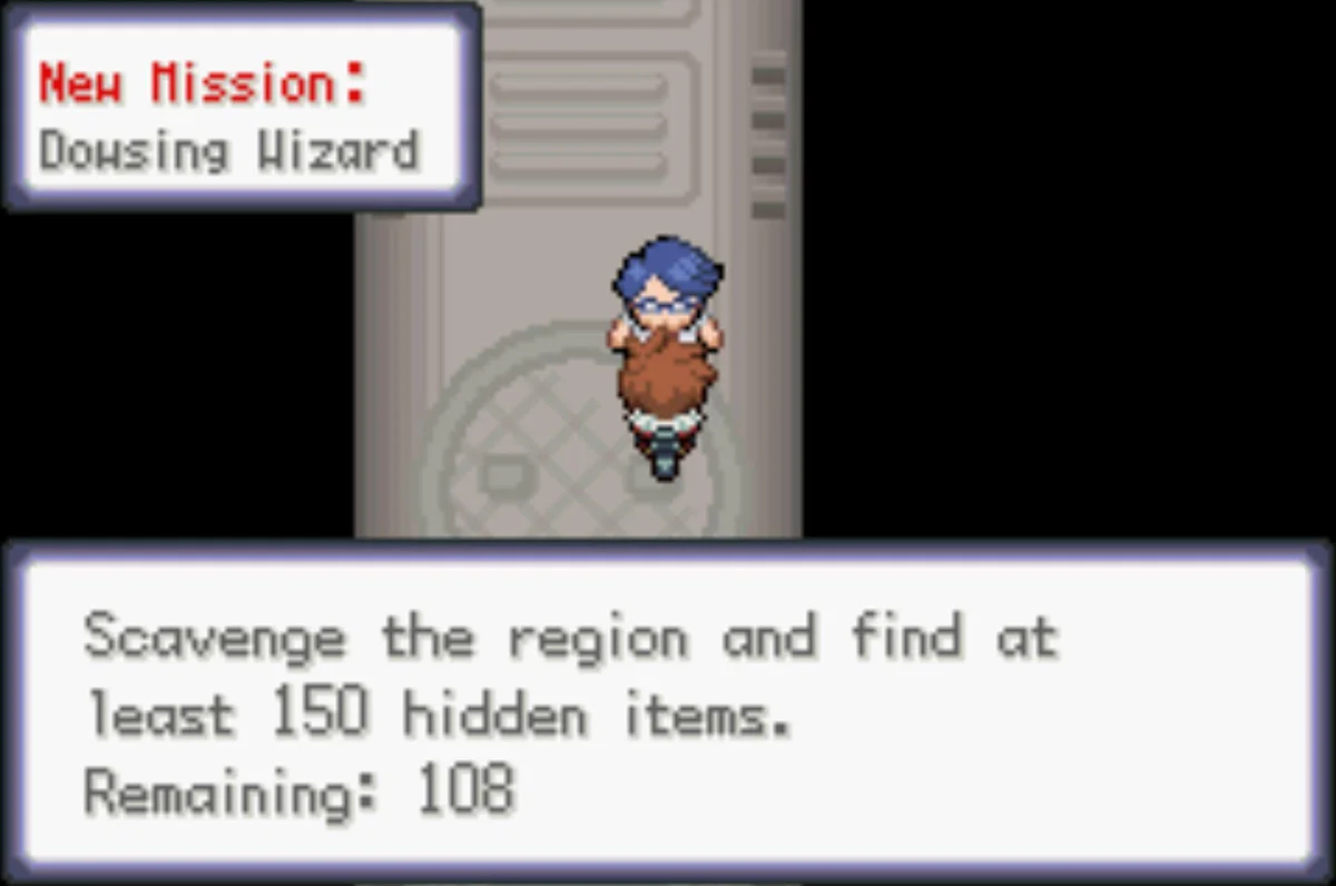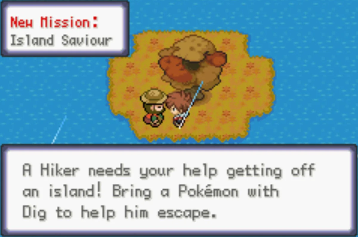 | #034: 섬의 구원자 (Island Saviour) | 어번 수로(Auburn Waterway) | 조건: 구멍파기 Dig를 배운 포켓몬 등산가가 로스트 터널(Lost Tunnel)을 탐험하는 것을 돕기 | 아이템 기술머신28 구멍파기 Dig | ![]() |