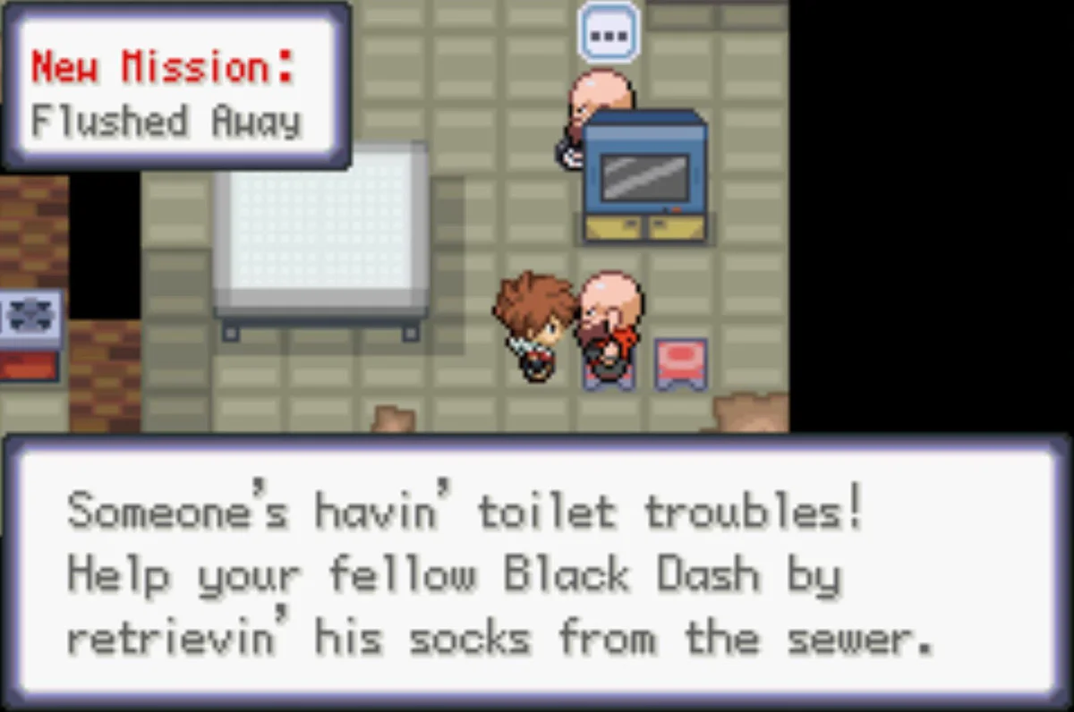 | #024: 하수구에 버린 양말 (Flushed Away) | 안티시스 시티(Antisis City) 검은 염무왕 조직(Black Emboar) 본부 | 조건: #061: 검은 염무왕 (The Black Emboar) 및 #073: 공포의 그랑블루 (The Terror Granbull) 안티시스 하수도(Antisis Sewers)에서 더러운 양말(Grimy Socks) 찾기 | 아이템 검은진흙 Black Sludge | ![]() |