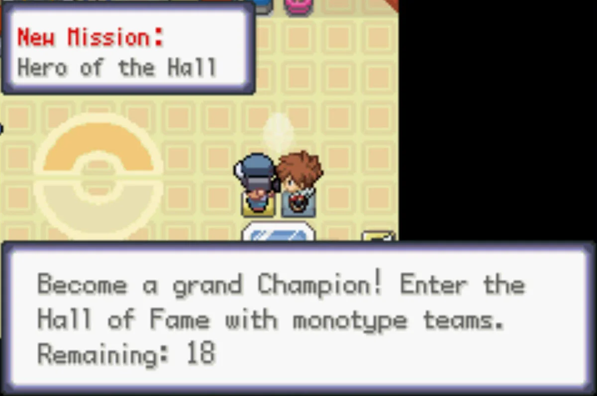 | #029: 전당의 영웅 (Hero of the Hall) | 18번 도로 포켓몬 센터 | 조건: 없음 각 타입별로 1개씩, 18가지 단일 타입 팀으로 포켓몬 리그 제패 | 아이템 1000 BP 큰금구슬 Big Nugget 18개 | ![]() |