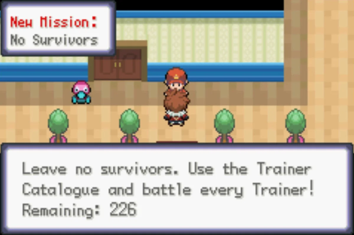 | #042: 생존자는 없다 (No Survivors) | 폴쇼어 시티(Fallshore City) 미션 본부(Mission HQ) | 조건: 미션 5개 완료 트레이너 카탈로그(Trainer Catalogue)를 사용하여 모든 트레이너와 배틀하기 | 아이템 라티오스나이트 Latiosite 또는 라티아스나이트 Latiasite (성별에 따라 다름) | ![]() |