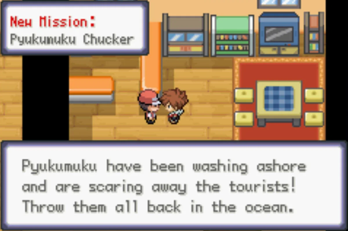 | #052: 해무기 투척 (Pyukumuku Chucker) | 데하라 시티(Dehara City) | 조건: 없음 데하라 해변에서 모든 해무기 Pyukumuku를 바다로 던져주기 | 아이템 파워밴드 Power Band | ![]() |