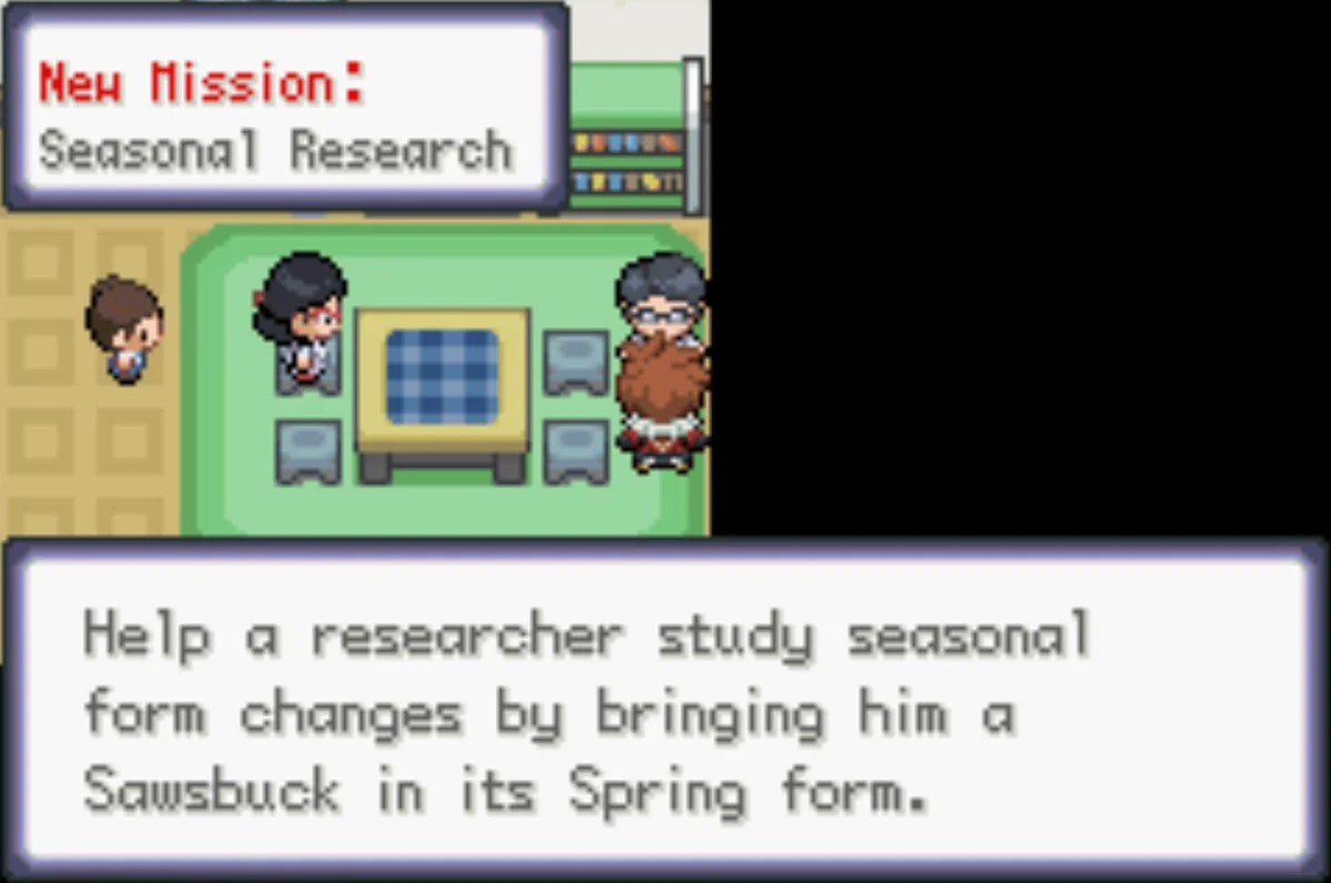 | #053: 계절 연구 (Seasonal Research) | 텔 타운(Tehl Town) | 조건: 없음 과학자에게 바라철록 Sawsbuck의 4가지 계절 모습을 모두 보여주기 | 아이템 무료 성격 변경 | ![]() |
