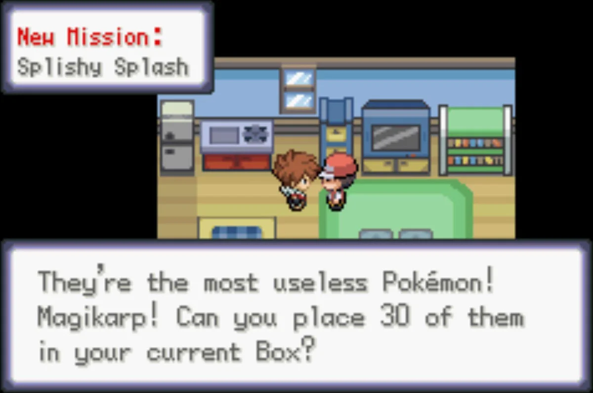 | #055: 첨벙첨벙 (Splishy Splash) | 레드우드 빌리지(Redwood Village) | 조건: 없음 잉어킹 Magikarp 30마리를 잡아 같은 박스에 넣기 | 포켓몬 이로치 잉어킹 Magikarp | ![]() |