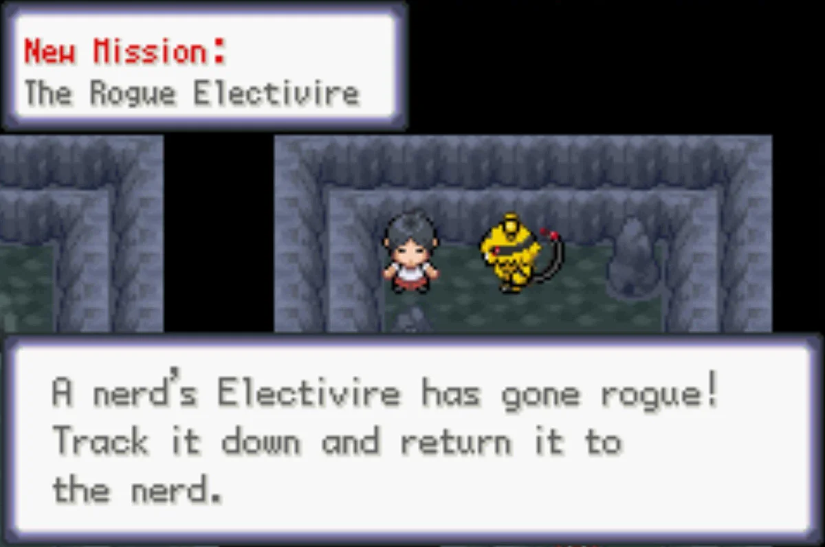 | #071: 난폭한 에레키블 (The Rogue Electivire) | 썬더캡 산(Thundercap Mountain) 4층 에레키블 Electivire 방 | 조건: 없음 에레키블 Electivire을 트레이너에게 돌려주세요. 썬더캡에서 물리친 다음, 시포트 시티에서 그것을 훔친 과학자와 다이맥스 폼을 상대로 배틀해야 합니다. | 아이템 에레키부스터 Electirizer 파워웨이트 Power Weight 금색병뚜껑 Gold Bottle Cap 포켓몬 에레키드 Elekid 알 | ![]() |
