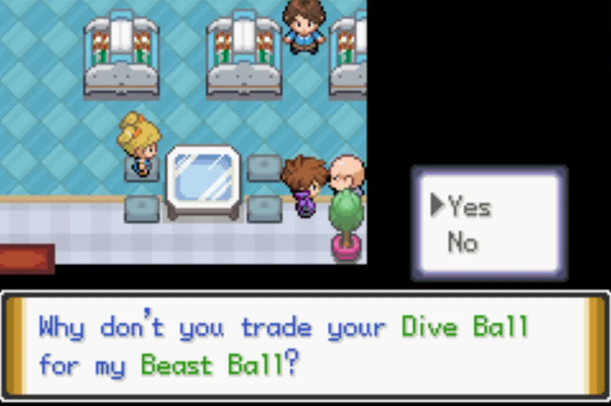 | 일일 이벤트 #004 다이브볼(Dive Ball)과 울트라볼(Beast Ball) 교환 | 크레이터 타운(Crater Town) 크레이터 타운 상점에 있는 불량배가 다이브볼(Dive Ball)을 울트라볼(Beast Ball)과 교환하고 싶어 합니다. | ![]() |