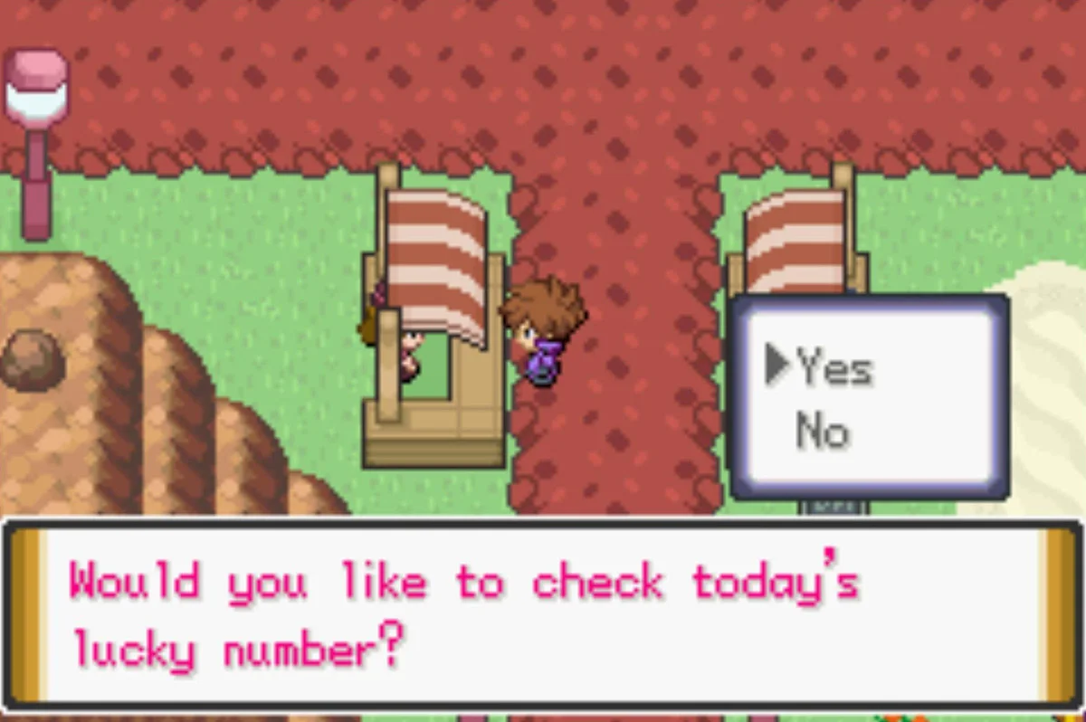 | 일일 이벤트 #018 BP 복권 | 배틀 프런티어(Battle Frontier) 중앙 텐트 열에 있는 노점상이 BP 경품을 위한 4자리 복권 번호를 고르라고 합니다. | ![]() |