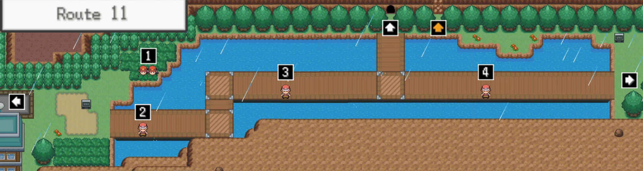 11번도로는 매우 직선적이며 주로 긴 나무 다리로 이루어져 있습니다. 여기서 잡을 수 있는 포켓몬이 몇 마리 있고, 트레이너들과의 배틀도 가치가 있습니다.