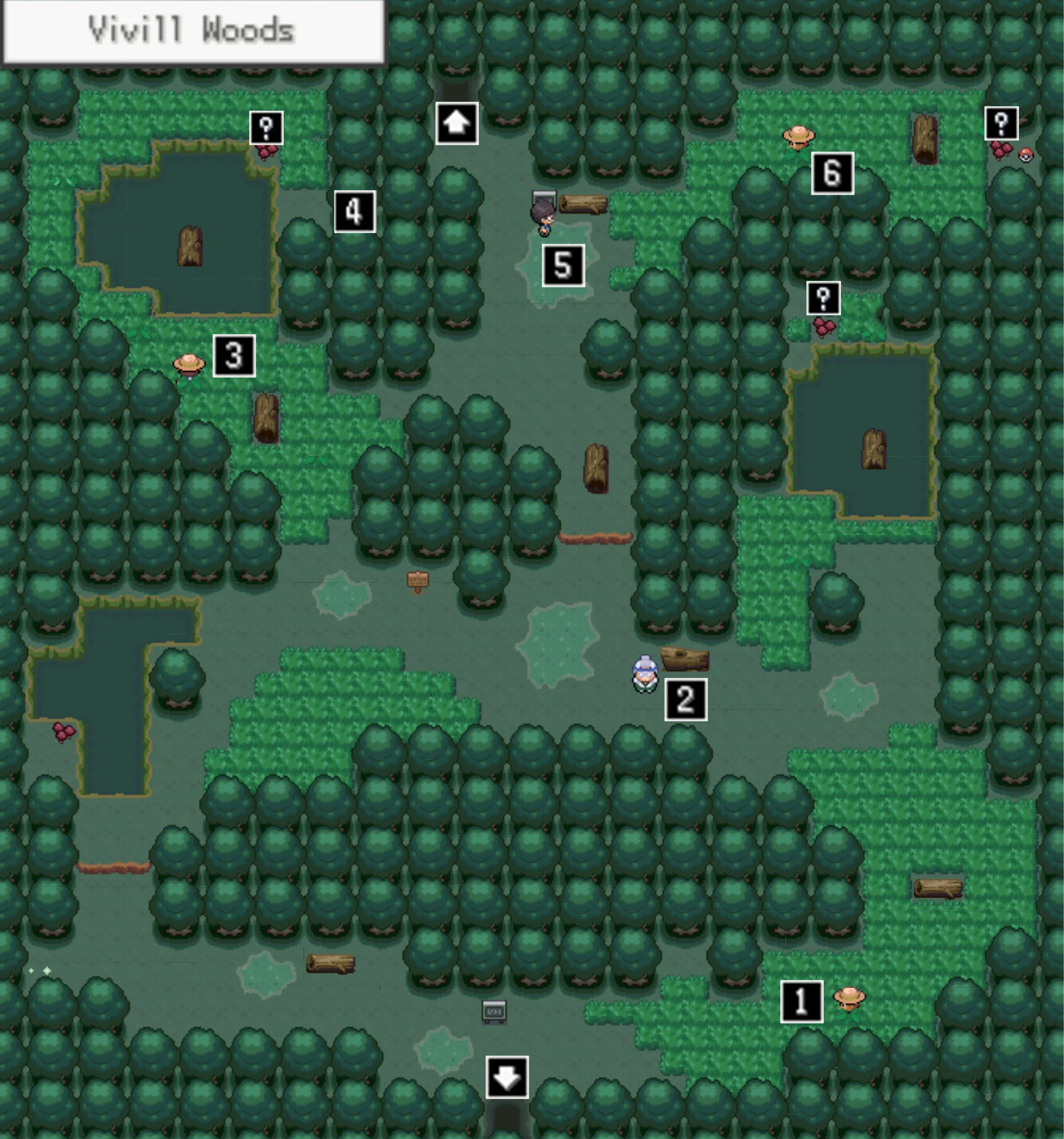 비빌 숲은 벌레 포켓몬과 그들을 사용하는 트레이너들로 가득하며, 파멸의 빛(Light of Ruin)을 막기 위해 비빌 타운으로 가려면 이곳을 통과해야 합니다.