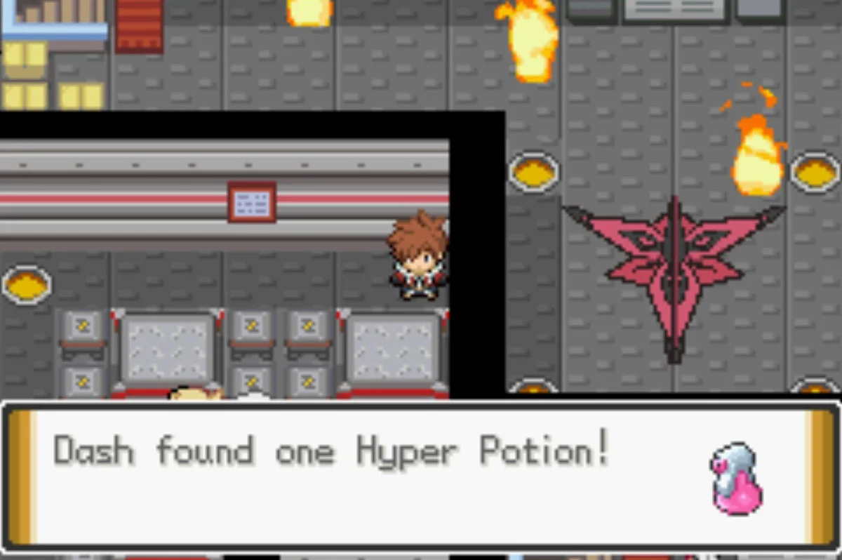 녀석을 쓰러뜨리면 아래층으로 가는 길이 열립니다. 조무래기들과의 전투 흔적으로 곳곳에 불꽃이 남아있는데, 닿으면 포켓몬이 화상을 입으니 주의하세요.