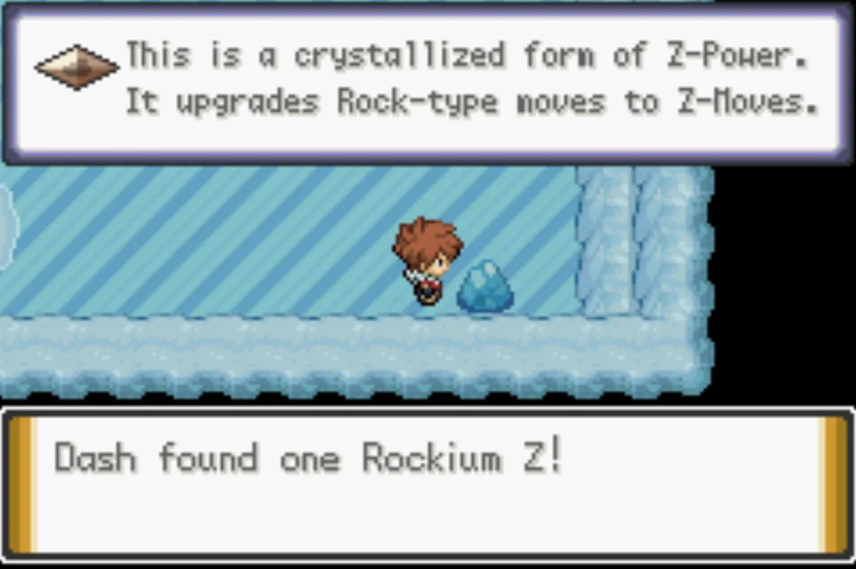 15단계: 남쪽으로 미끄러져 바위로 가세요. 이 바위에는 바위Z Rockium Z가 숨겨져 있어, 바위 타입 기술을 사용하는 강력한 포켓몬에게 유용합니다.